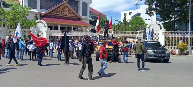 Selain menyampaikan orasinya, para pendemo juga membawa sejumlah atribut berupa poster yang bertuliskan tuntutan-tuntutan mereka. Aksi tersebut dikawal oleh puluhan anggota kepolisian.(ks10)