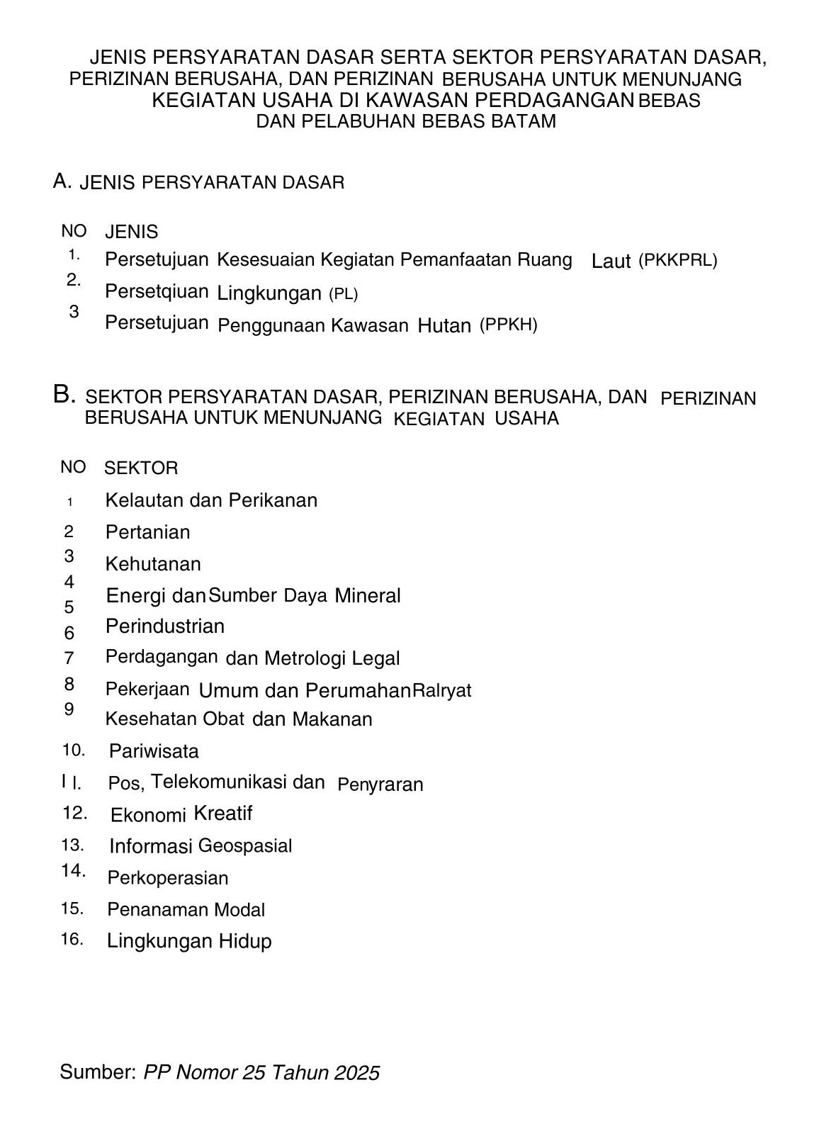 Pada pasal 20 ayat 2 PP 25/2025 tersebut, Badan Pengusahaan Batam berwenang: a. Menerbitkan seluruh persyaratan dasar termasuk Persetujuan Kawasan Hutan, Perizinan Berusaha, dan Perizinan Berusahan untuk Menunjang Kegiatan Usaha bagi para pelaku yang mendirikan dan menjalankan usaha di KPBPB Batam dalam rangka mengembangkan kegiatan di bidang ekonomi, dan; b. Menetapkan jenis dan jumlah barang Barang Konsumsi serta menerbitkan perizinan pemasukannya.